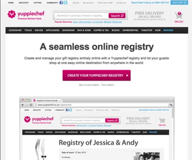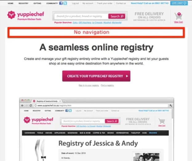 Yuppiechef wanted to increase the number of wedding registrations (conversion goal) received from the Wedding Registry landing page on their website. They tested two identical pages, except for the main navigation bar at the top of the page. It’s simple. This landing page had a mix of different traffic sources, including: Google Adwords (search and display network), Facebook, third-party advertisers, directories, organic search and direct traffic. Here’s what the original page looked like: