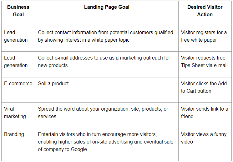 Since determining the right online strategy to achieve a business goal is a complex task beyond the scope of this book, we will assume that you already know what your landing pages want to accomplish. Nevertheless, here are some examples of specific landing page conversion goals and how they might relate to a business goal: